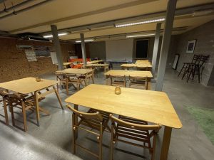 In de cursusruimte zijn tafels en stoelen voorzien .